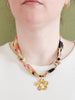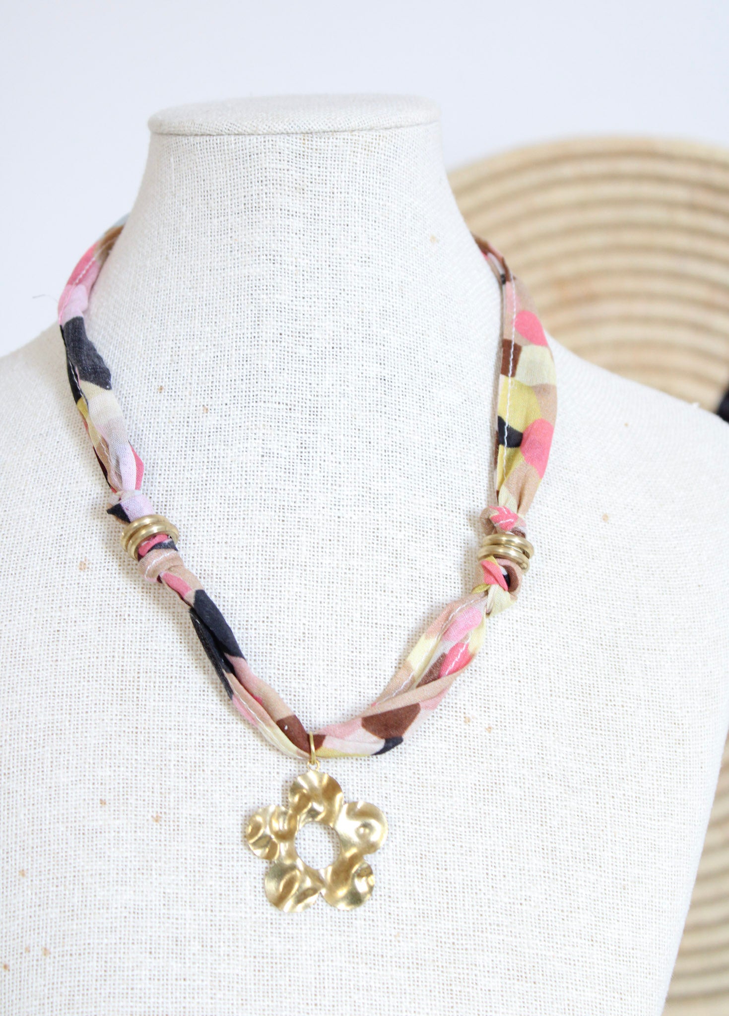 This necklace feels effortlessly artistic and sun-warmed — the soft patterned fabric mixed with the sculptural brass flower pendant gives it a bohemian yet refined energy.