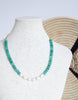 This necklace features a beautiful combination of green aventurine gemstones, freshwater pearls, and a gold paperclip chain.